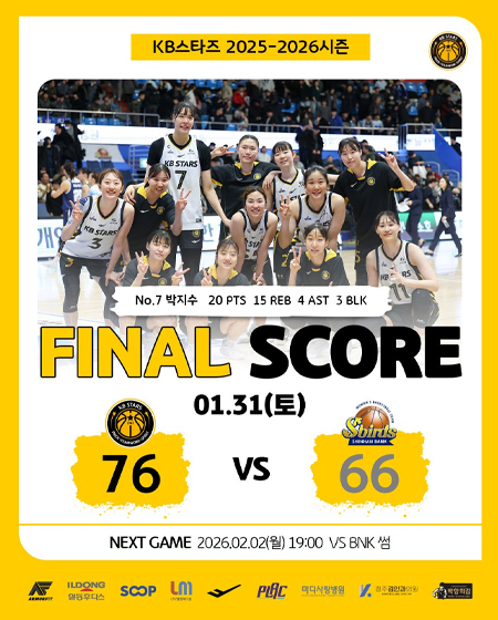 #KB스타즈1월 31일 [경기 결과] 작성일 2026-01-31 조회 42 공유하기 페이스북 공유 트위터 공유 카카오스토리 공유 KB스타즈 | 1월 31일 [경기 결과]KB스타즈 76-66 신한은행Photo in Incheon_ 2026.01.31#KB스타즈 ㅣ #정규리그 ㅣ #GAMEDAY#2025_2026시즌 #원정경기 #경기결과#4라운드 #GAME5 #승리 #13승7패#플랙 #프로스펙스 #SOOP#엘앰메디컬 #청주김안과의원#마디사랑병원 #일동후디스#박향희김 #아머핏 [자세히보기]