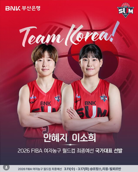 #BNK 썸두 선수에게 많은 응원 부탁드립니다! 작성일 2026-02-04 조회 32 공유하기 페이스북 공유 트위터 공유 카카오스토리 공유 BNK 썸 안혜지, 이소희 선수가2026 FIBA 여자농구 월드컵 최종예선 국가대표에 선발되었습니다!태극마크를 달고 당당히 세계 무대에 나서는두 선수에게 많은 응원 부탁드립니다!#BNK썸 #BNK썸여자프로농구단 #BNK부산은행 #안혜지 #이소희 [자세히보기]