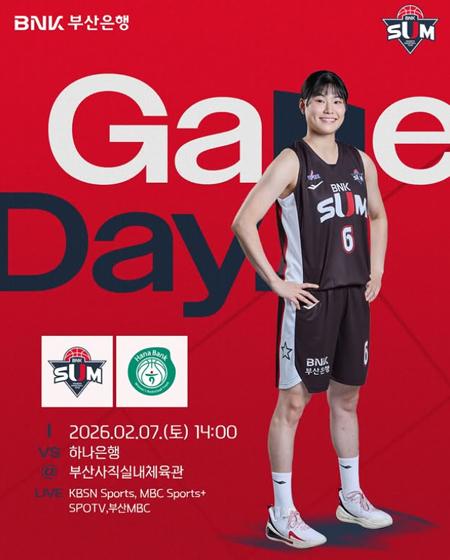 #BNK 썸GAME DAY 작성일 2026-02-07 조회 29 공유하기 페이스북 공유 트위터 공유 카카오스토리 공유 2025-2026시즌 BNK 썸GAME DAY일시 : 2026년 2월 7일(토) 14:00장소 : 부산사직실내체육관vs 하나은행중계 : KBSN Sports, MBC Sports+, SPOTV,부산MBC #BNK썸 #BNK썸여자프로농구단 #BNK부산은행 [자세히보기]