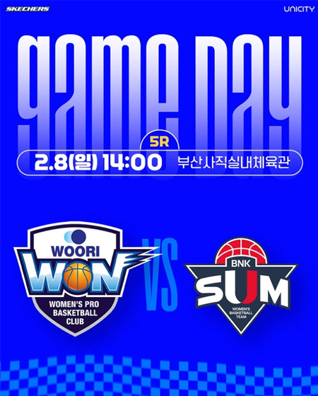 #우리은행GAME DAY 작성일 2026-02-08 조회 20 공유하기 페이스북 공유 트위터 공유 카카오스토리 공유 GAME DAY? 2026.2.8(일) 14시우리은행 vs BNK썸장소 : 부산사직실내체육관TV 생중계 : KBS N 스포츠, MBC Sports+, SPOTV, 부산MBC온라인 생중계 : 스포티비NOW, 네이버스포츠, 카카오TV, SOOP, WKBL APP#우리은행우리WON #경기안내#UNICITY #스케쳐스 #우뱅이네 [자세히보기]