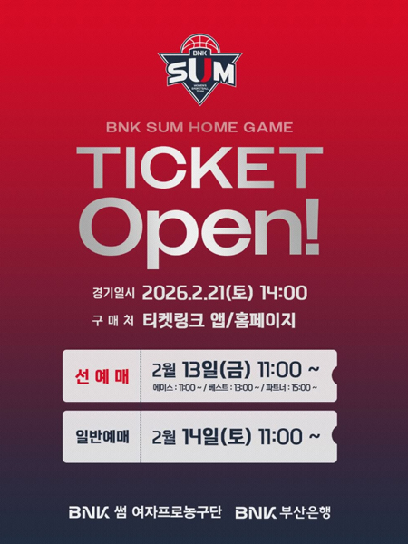 #BNK 썸BNK 썸 티켓 오픈! 작성일 2026-02-13 조회 19 공유하기 페이스북 공유 트위터 공유 카카오스토리 공유 BNK 금융 2025-2026 여자프로농구BNK 썸 티켓 오픈!일시 2026.2.21(토) 14:00장소 : 부산사직실내체육관VS 삼성생명 블루밍스예매 오픈 시간선예매 : 2월 13일(금) 11:00 ~ *등급별 시간 상이> ACE : 11:00 ~ / BEST : 13:00 ~ / PARTNER : 15:00 ~일반예매 : 2월 14일(토) 11:00 ~#BNK썸 #BNK썸여자프로농구단 #BNK부산은행 [자세히보기]
