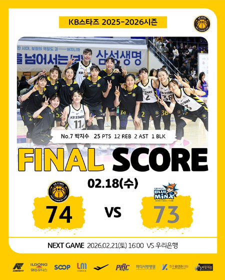 #KB스타즈2월 18일 [경기 결과] 작성일 2026-02-18 조회 29 공유하기 페이스북 공유 트위터 공유 카카오스토리 공유 KB스타즈 | 2월 18일 [경기 결과]KB스타즈 74-73 삼성생명Photo in Yongin_ 2026.02.18#KB스타즈 ㅣ #정규리그 ㅣ #GAMEDAY#2025_2026시즌 #원정경기 #경기결과#5라운드 #GAME5 #승리 #17승8패#플랙 #프로스펙스 #SOOP#엘앰메디컬 #청주김안과의원#마디사랑병원 #일동후디스#박향희김 #아머핏? [자세히보기]