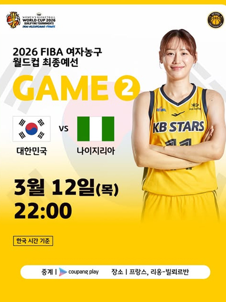 #KB스타즈KOREA Game 2 작성일 2026-03-12 조회 25 공유하기 페이스북 공유 트위터 공유 카카오스토리 공유 KB스타즈 KOREA Game 2「2026 FIBA 여자농구 월드컵 최종예선」FIBA Women's Basketball World Cup 2026 Qualifying Tournament?대한민국 vs 나이지리아?일시ㅣ2026. 3. 12.(목) 22:00 (한국시간)장소ㅣFrance, Villeurbanne Astroballe경기 중계ㅣcoupang play [자세히보기]