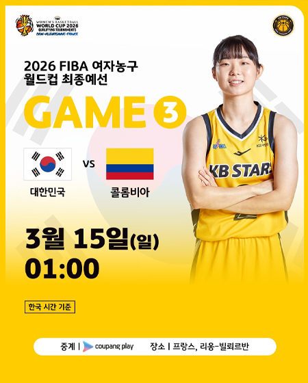 #KB스타즈KOREA Game 3 작성일 2026-03-14 조회 69 공유하기 페이스북 공유 트위터 공유 카카오스토리 공유 KB스타즈 | KOREA Game 3?「2026 FIBA 여자농구 월드컵 최종예선」FIBA Women's Basketball World Cup 2026 Qualifying Tournament대한민국 vs 콜롬비아일시ㅣ2026. 3. 15.(일) 01:00 (한국시간)장소ㅣFrance, Villeurbanne Astroballe경기 중계ㅣcoupang play#KB스타즈 ㅣ #2026FIBA여자농구월드컵최종예선 ㅣ #GAME3#대한민국 #국가대표팀 #여자농구국가대표#국가대표 #강이슬 #박지수 #허예은#국가대표강이슬 #국가대표박지수 #국가대표허예은#FIBA #여자농구월드컵 #FIBAWWC #WeOwnTheGame#TeamKorea #국대즈 #파이팅 [자세히보기]