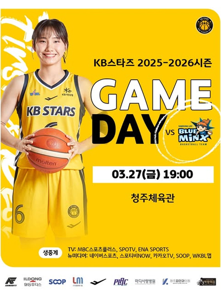 #KB스타즈GAME DAY 작성일 2026-03-27 조회 48 공유하기 페이스북 공유 트위터 공유 카카오스토리 공유 KB스타즈 GAME DAY2026년 3월 27일(금) 19:00KB스타즈 vs 삼성생명경기 장소: 청주체육관TV 생중계: MBC스포츠플러스, SPOTV, ENA SPORTS뉴미디어 생중계: 네이버스포츠, 스포티비NOW, 카카오TV, SOOP, WKBL앱[자세히보기]