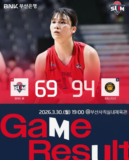 #BNK 썸2026.3.30.(월) KB스타즈와의 경기 결과입니다 작성일 2026-03-30 조회 32 공유하기 페이스북 공유 트위터 공유 카카오스토리 공유 2026.3.30.(월) KB스타즈와의 경기 결과입니다#BNK썸 #BNK썸여자프로농구단 #BNK부산은행 [자세히보기]