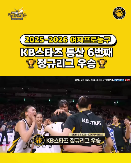 #KB스타즈2025-2026 여자프로농구 정규리그 우승 작성일 2026-03-30 조회 21 공유하기 페이스북 공유 트위터 공유 카카오스토리 공유 KB스타 | 정규리그 우승 2025-2026 여자프로농구 정규리그 우승 #정규리그우승 ㅣ #KB스타즈 ㅣ #국민농구방송 정규리그 #우승 #세리머니 [자세히보기]