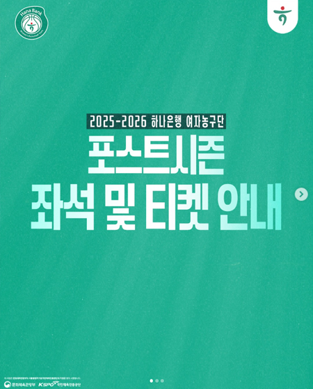 #하나은행2025-2026 하나은행 포스트시즌 좌석 및 티켓 안내 작성일 2026-04-02 조회 26 공유하기 페이스북 공유 트위터 공유 카카오스토리 공유 2025-2026 하나은행 포스트시즌 좌석 및 티켓 안내4월 9일 목요일부터 시작되는하나은행의 봄 농구팬 여러분들의 많은 응원 부탁드립니다#하나은행여자농구단 #하나은행 #하나금융그룹 #농구 #여자농구 [자세히보기]