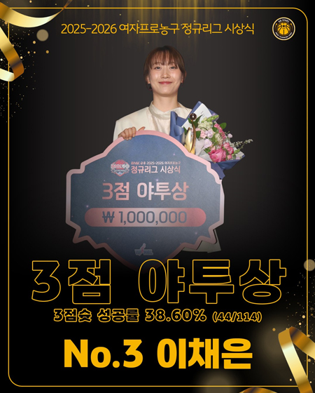 #KB스타즈이채은, '3점 야투상' 작성일 2026-04-06 조회 37 공유하기 페이스북 공유 트위터 공유 카카오스토리 공유 KB스타즈 | 이채은, '3점 야투상'「2025-2026시즌 여자프로농구 정규리그 시상식」KB스타즈 No.3 이채은3점 야투상3점슛 성공률 38.6% (44/114)Photo day in_ 2026.04.06#KB스타즈 ㅣ #정규리그시상식 ㅣ #이채은 ㅣ #3점야투상#No3 #이채은선수 #3점성공률 #1위 #축하합니다#2025_2026시즌 #정규리그 #시상식 #현장스케치#청주KB스타즈 #KB스타즈농구단#KBSTARS #KBスタ?ズ #First_and_Best#WKBL #여자농구 #여농#유튜브채널 #국민농구방송? [자세히보기]
