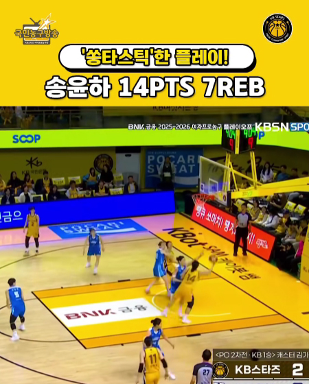 #KB스타즈쏭하, 4쿼터 장악!! 플레이오프 모드 ON! 작성일 2026-04-11 조회 16 공유하기 페이스북 공유 트위터 공유 카카오스토리 공유 KB스타즈 | 쏭하, 4쿼터 장악!! 플레이오프 모드 ON! 송윤하, 최고 효울!! 쏭하짱~ 14득점/7리바운드/1블록 #송윤하 ㅣ #KB스타즈 ㅣ #국민농구방송 #송윤하선수 #송윤하농구 2025_2026시즌 ㅣ 플레이오프 ㅣ playoffs [자세히보기]