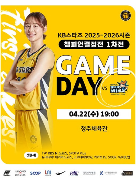#KB스타즈챔피언결정전 1차전 GAME DAY 작성일 2026-04-22 조회 40 공유하기 페이스북 공유 트위터 공유 카카오스토리 공유 KB스타즈 「챔피언결정전 1차전」 GAME DAY?2026년 4월 22일(수) 19:00KB스타즈 vs 삼성생명경기 장소: 청주체육관TV 생중계: KBS N 스포츠, SPOTV Plus뉴미디어 생중계: 네이버스포츠, 스포티비NOW, 카카오TV, SOOP, WKBL앱 [자세히보기]