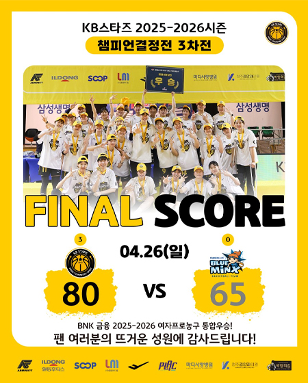 #KB스타즈통합우승 V3 작성일 2026-04-26 조회 35 공유하기 페이스북 공유 트위터 공유 카카오스토리 공유 KB스타즈 | 통합우승 V32025-2026 여자프로농구 통합우승KB스타즈 80-65 삼성생명Photo in Yongin_ 2026.04.26#KB스타즈 ㅣ #챔피언결정전 ㅣ #Champion#2025_2026시즌 #finals #챔피언결정전3차전#경기결과 #시리즈 #3승 #통합우승 #V3#플랙 #프로스펙스 #SOOP#엘앰메디컬 #청주김안과의원#마디사랑병원 #일동후디스#박향희김 #아머핏#청주KB스타즈 #KB스타즈농구단#KBSTARS #KBスタ?ズ #First_and_Best#WKBL #여자농구 #여농#유튜브채널 #국민농구방송? [자세히보기]